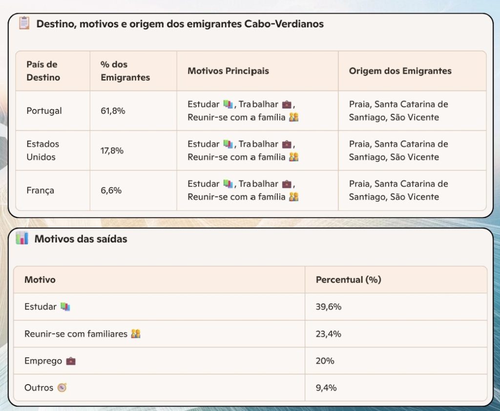 O inquérito mostra que Portugal é eleito por 61,9% dos emigrantes recentes, seguido pelos Estados Unidos (17,8%) e França (6,6%). As razões para a partida são variadas: quase 40% procuram estudar, outros procuram reencontrar familiares, encontrar emprego ou tratar de saúde. A maioria parte das regiões da Praia, Santa Catarina de Santiago e São Vicente, deixando comunidades e famílias com lugares vazios à mesa e sonhos adiados.