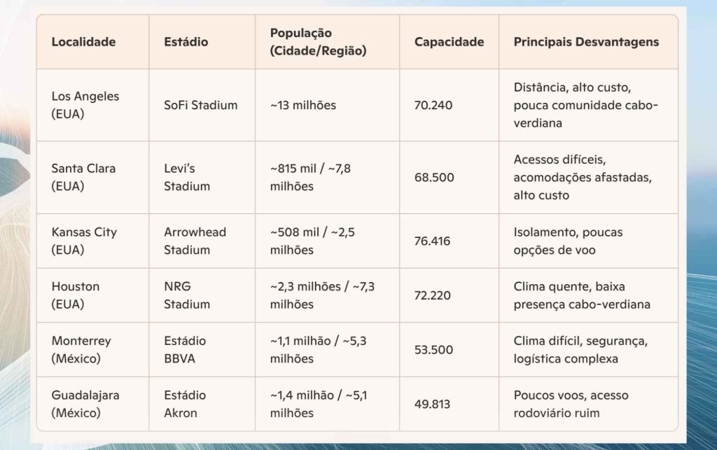 México (exceto Cidade do México): Os estádios de Monterrey e Guadalajara, ainda que belos e modernos, são logisticamente difíceis e caros para os viajantes de Cabo Verde, e menos acolhedores para o apoio “em casa”.