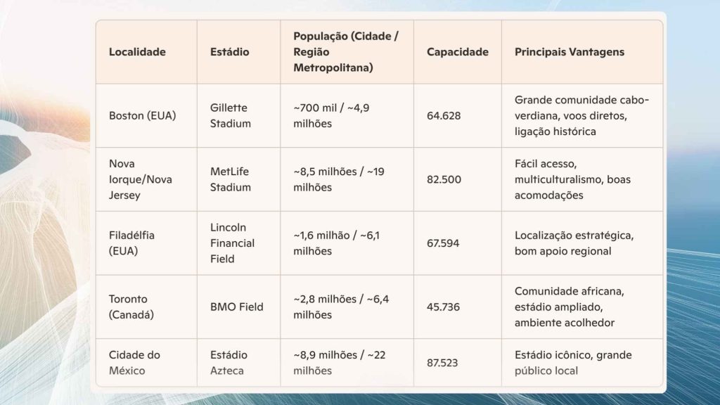 “A histórica qualificação de Cabo Verde para o Mundial 2026 é motivo de orgulho para todo o povo cabo-verdiano. Mas onde será mais fácil — ou mais difícil — sentir-se “em casa” nos estádios dos EUA, México e Canadá? A nossa análise revela as melhores e piores praças para transformar o sonho em festa nacional e as que podem complicar o apoio aos nossos heróis.”