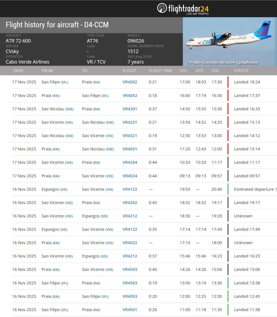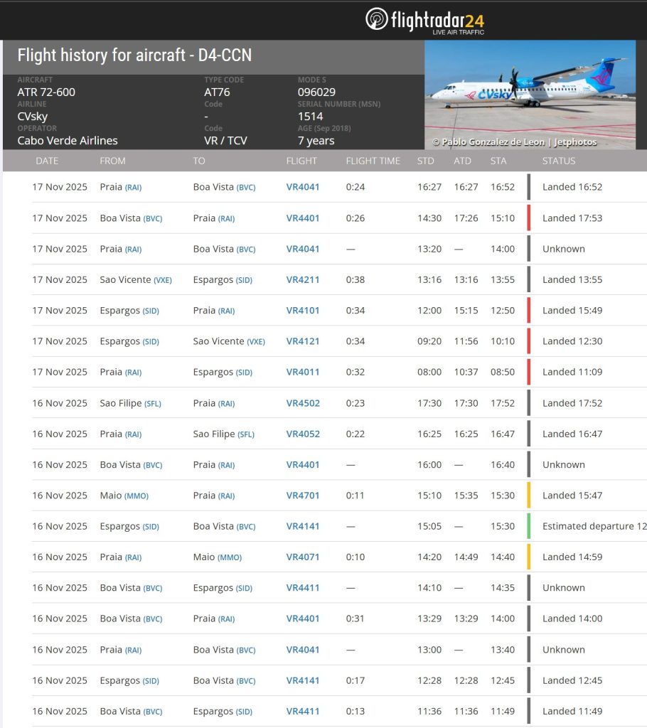 A Cabo Verde Airlines enfrentou sérias dificuldades operacionais entre sábado, 16, e segunda-feira, 17 de novembro, com os seus dois aeronaves ATR 72-600 (matrículas D4-CCM e D4-CCN) a registarem vários atrasos significativos e, mais preocupante, pelo menos sete voos com estatuto “desconhecido” (Unknown), o que indica possíveis cancelamentos ou graves perturbações operacionais.