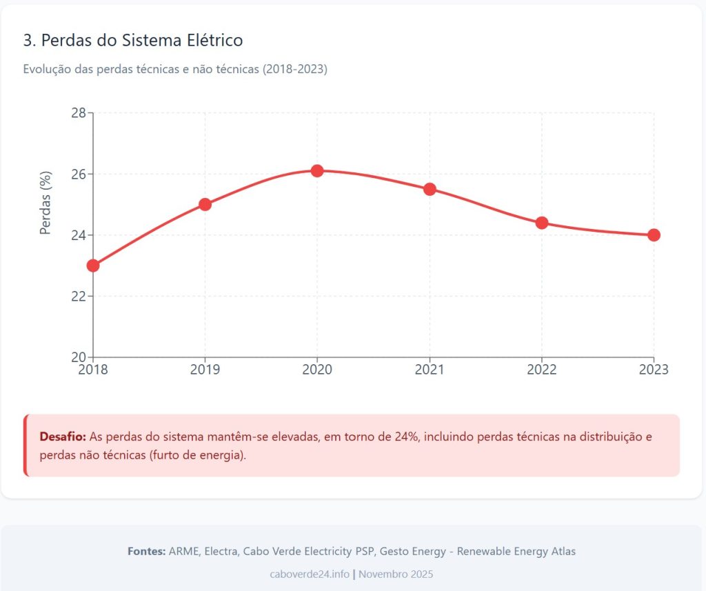 No entanto, a situação desfavorável continua acentuada pelos frequentes cortes e suspensões no fornecimento de eletricidade, muitas vezes sem aviso prévio, impactando negativamente os setores residencial, comercial e industrial. Um episódio recente e emblemático foi a paralisação prolongada no fornecimento na cidade da Praia, que evidenciou a fragilidade da infraestrutura elétrica local. Adicionalmente, as perdas técnicas e não técnicas do sistema mantêm-se elevadas, situando-se em torno de 24%.