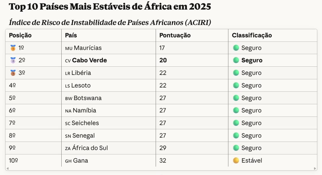 Cabo Verde consolidou a sua posição como um dos países mais seguros e estáveis do continente africano, conquistando o segundo lugar no Índice de Risco de Instabilidade de Países Africanos 2025 (ACIRI), divulgado esta semana pela SBM Intelligence, consultoria de pesquisa geopolítica e análise de risco focada em África. O arquipélago obteve uma pontuação de 20 pontos, ficando apenas atrás das Maurícias, que liderou o ranking com 17 pontos.