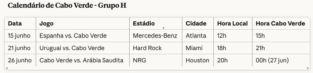 A estreia histórica de Cabo Verde num Mundial acontecerá no dia 15 de junho, às 15h (hora cabo-verdiana), frente à Espanha no Mercedes-Benz Stadium, em Atlanta. Inaugurado em 2017 com um investimento superior a 1,6 mil milhões de dólares, este recinto é considerado um dos mais inovadores do mundo.