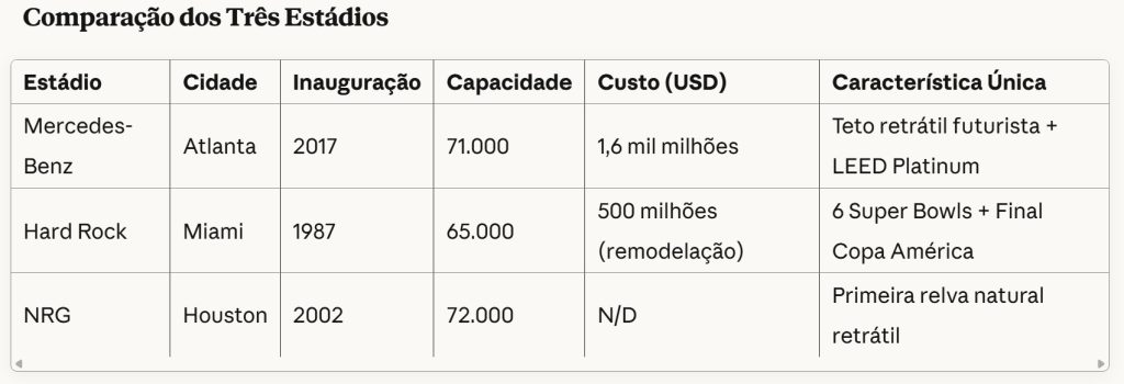 A seleção nacional de Cabo Verde fará história em Atlanta, Miami e Houston, enfrentando Espanha, Uruguai e Arábia Saudita em três estádios que representam o topo da infraestrutura desportiva mundial. Pela primeira vez qualificados para um Mundial, os Tubarões Azuis jogarão em recintos com investimentos milionários, tecnologia de ponta e capacidade combinada superior a 200.000 espectadores.