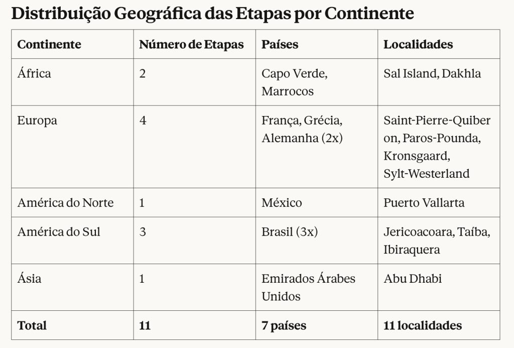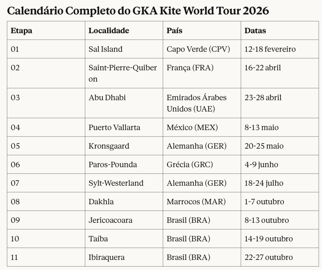 O GKA Kite World Tour 2026 inclui 11 etapas distribuídas por quatro continentes, passando por destinos de referência mundial no kitesurf. A competição arranca em Capo Verde e percorre locais emblemáticos como Sylt (Alemanha), Tarifa (Espanha), Paros (Grécia), Dakhla (Marrocos), Abu Dhabi (Emirados Árabes Unidos), Puerto Vallarta (México), Jericoacoara e Taíba (Brasil).
