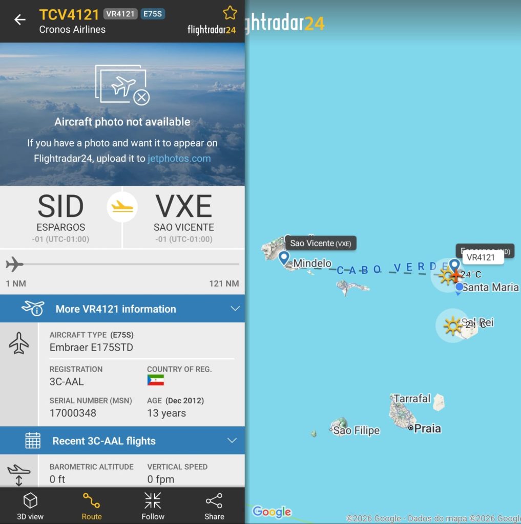 Durante a nossa monitorização, identificámos um Embraer E175 a operar sob os códigos de voo da TACV (Cabo Verde Airlines). Trata-se de uma aeronave pertencente à companhia Cronos Airlines, com sede na Guiné Equatorial, ostentando a matrícula 3C-AAL.