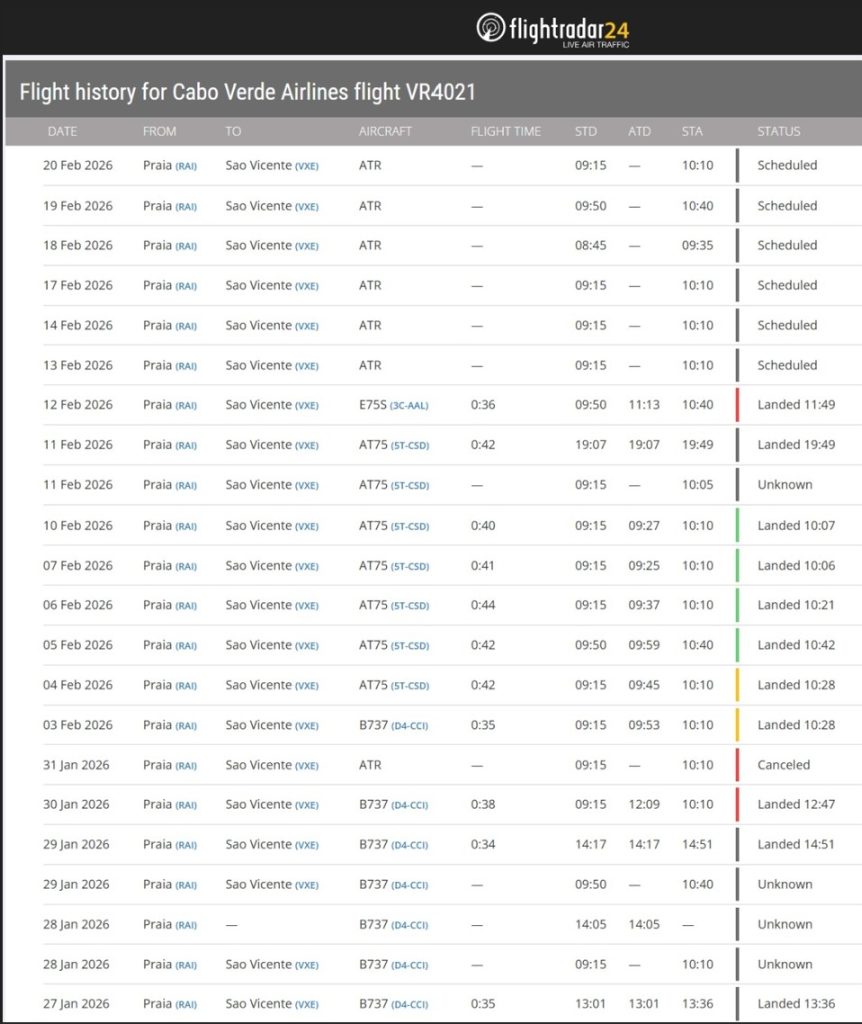 A análise do percurso deste aparelho revela que o avião partiu de Malabo, na Guiné Equatorial, tendo feito escala em Dakar antes de aterrar no Aeroporto Internacional Nelson Mandela, na Praia. Hoje, 12 de fevereiro, o aparelho iniciou oficialmente o serviço inter-ilhas, embora os registos indiquem que os primeiros voos tenham ocorrido com atrasos significativos em relação ao horário previsto.