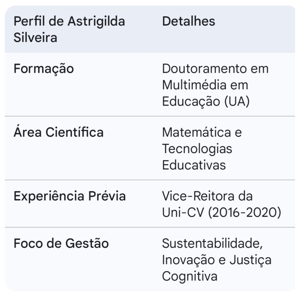​A Universidade de Cabo Verde (Uni-CV) entrou numa nova etapa da sua história institucional com a eleição da Professora Doutora Astrigilda Silveira. Após uma disputa renhida na segunda volta das eleições, onde obteve 50,65% dos votos contra os 46,63% de Crisanto Barros, a comunidade académica e a sociedade civil procuram agora conhecer melhor a figura que liderará o destino de milhares de estudantes e docentes nos próximos quatro anos.