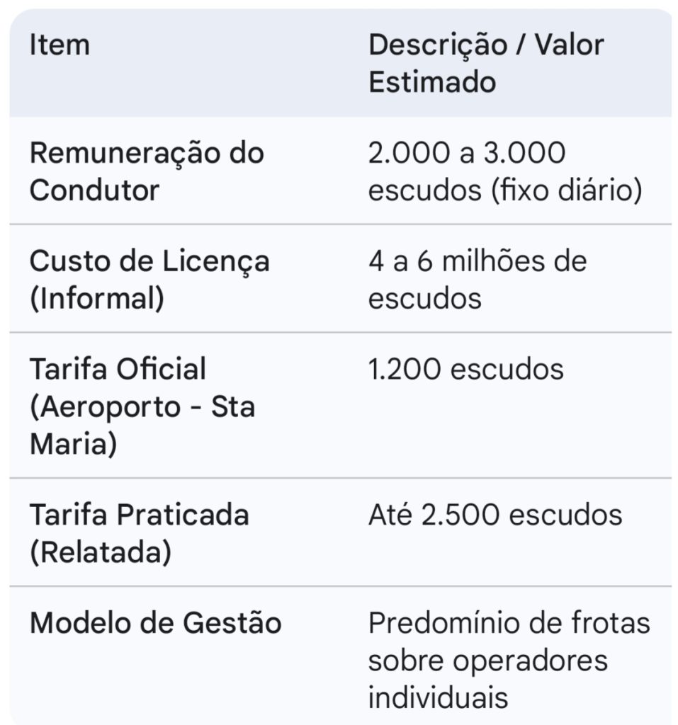 Esta concentração reflete-se no mercado informal de licenças. De acordo com informações recolhidas junto de profissionais, a aquisição de uma licença para operar de forma própria pode atingir valores entre os 4 e 6 milhões de escudos no mercado secundário, um montante proibitivo para a maioria dos condutores.
