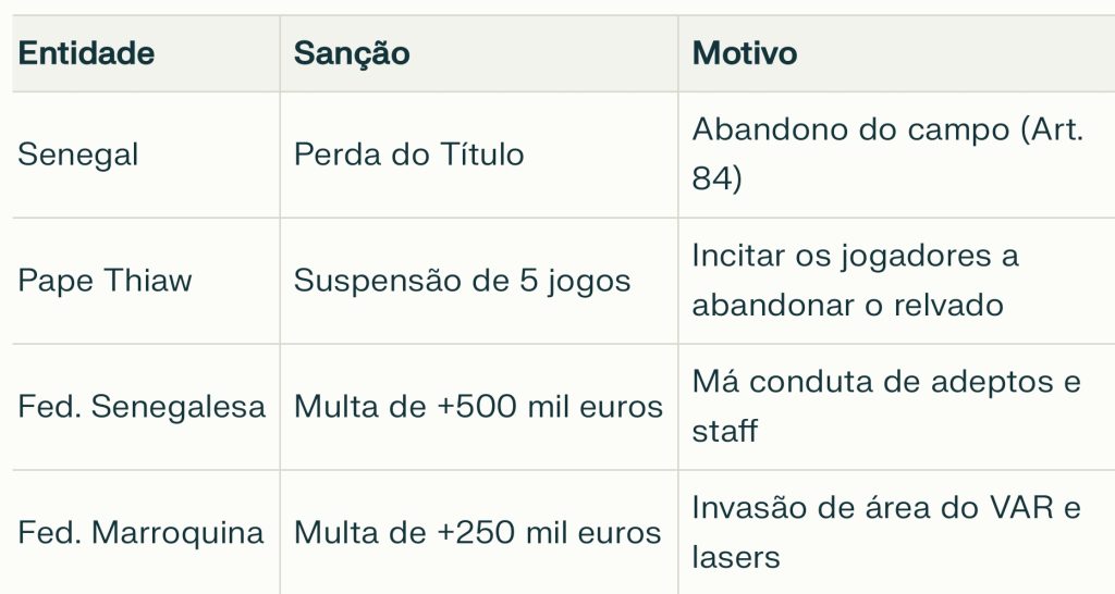 A sanção surge após uma investigação detalhada aos incidentes ocorridos durante a final disputada em solo marroquino. Na altura, a seleção do Senegal abandonou o relvado em protesto contra uma decisão de arbitragem nos minutos finais do tempo regulamentar.