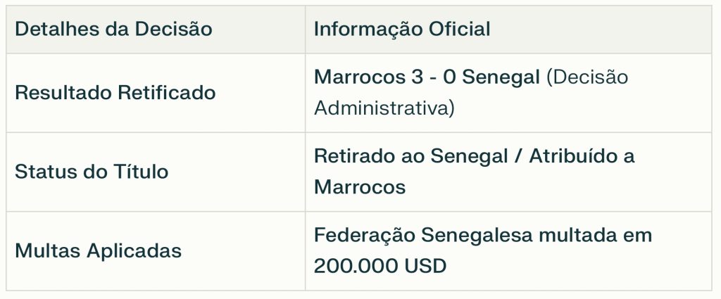 A Confederação Africana de Futebol (CAF) emitiu hoje uma decisão histórica que altera o desfecho da última edição do Campeonato Africano das Nações. Devido a infrações disciplinares na final de 2025, o Senegal perde o troféu na secretaria.