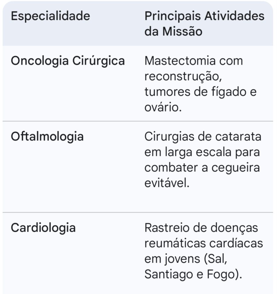 Entre as diversas intervenções previstas até ao dia 24 de abril, o grande destaque recai sobre a realização da primeira mastectomia com reconstrução imediata em solo cabo-verdiano. Este procedimento é considerado um marco inédito, pois permite que a paciente, ao ser submetida à remoção da mama devido ao cancro, receba a reconstrução plástica no mesmo ato cirúrgico, mitigando traumas físicos e psicológicos profundos que, até então, eram comuns pela falta de resposta interna.