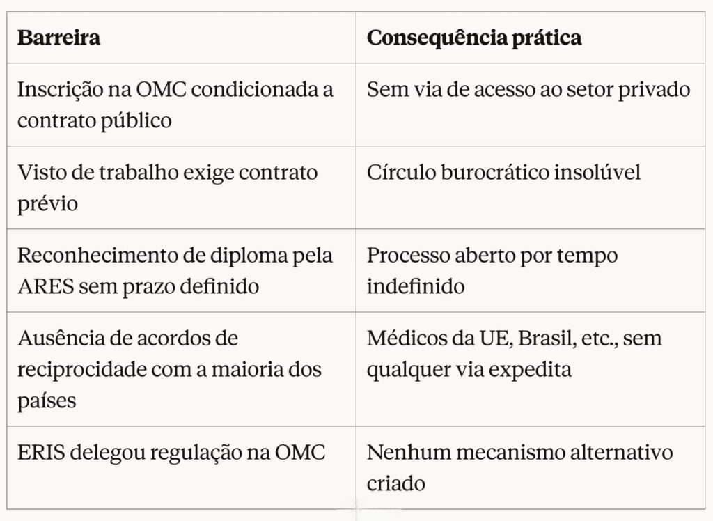 Esta distinção tem uma consequência prática determinante: um médico estrangeiro que queira exercer no setor privado — numa clínica, num consultório independente, junto da hotelaria turística — não tem qualquer via de acesso direta à inscrição na Ordem. Sem inscrição, não pode exercer legalmente. Sem exercício legal, não pode ter contrato. Sem contrato, não pode ter visto de trabalho. E sem autorização de residência ou visto, qualquer contrato de trabalho celebrado é juridicamente nulo, devendo ainda ser visado pela Direção Geral de Trabalho. Um ciclo vicioso que se fecha sobre si mesmo.