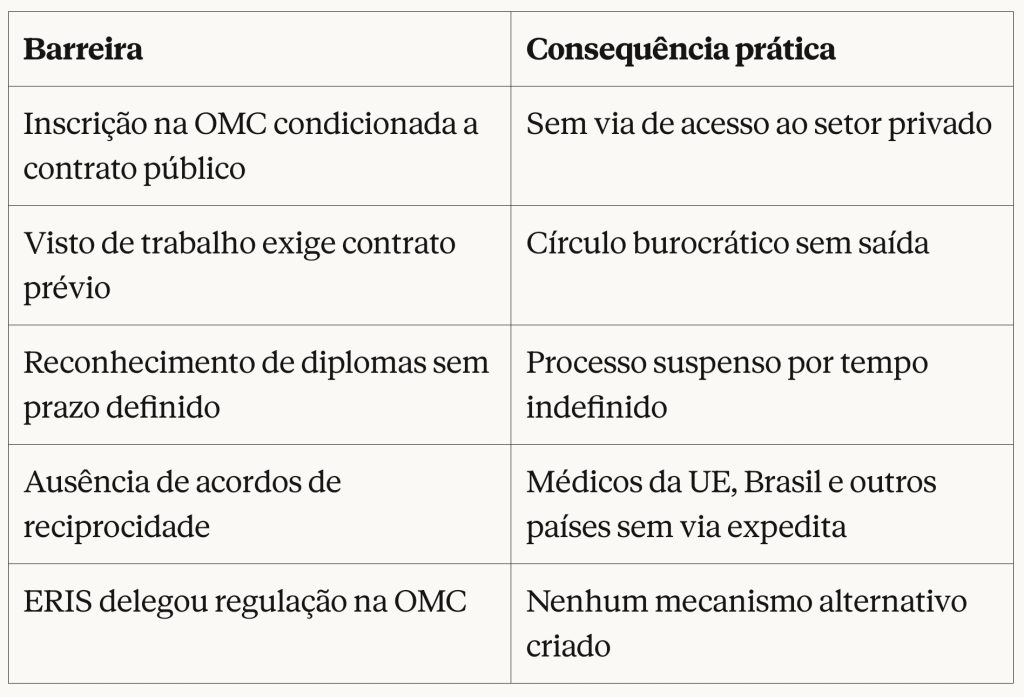 Agrava este quadro uma tensão institucional de fundo: o Ministério da Saúde já afirmou publicamente que a OMC não tem competências em matéria de regulação do acesso à profissão, que deveria ficar limitada a questões de ética e deontologia. Mas se assim é, competiria ao próprio ministério criar mecanismos alternativos — o que até hoje não aconteceu. A ERIS dispensou do seu registo os médicos inscritos nas ordens profissionais que pretendam exercer no setor privado, delegando essa função na OMC. Resultado: todos delegam, ninguém resolve.
