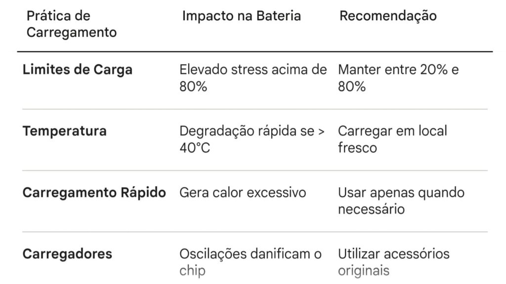 ​A tentação de utilizar carregadores de baixo custo, frequentemente encontrados em mercados informais, é grande, mas o risco é desproporcional. Carregadores certificados e cabos de boa qualidade garantem que a corrente elétrica fornecida seja constante e filtrada. Oscilações de voltagem causadas por acessórios de má qualidade podem danificar não só a bateria, mas também o chip de gestão de energia da placa-mãe do dispositivo, um reparo muitas vezes mais dispendioso do que o valor poupado num carregador barato.