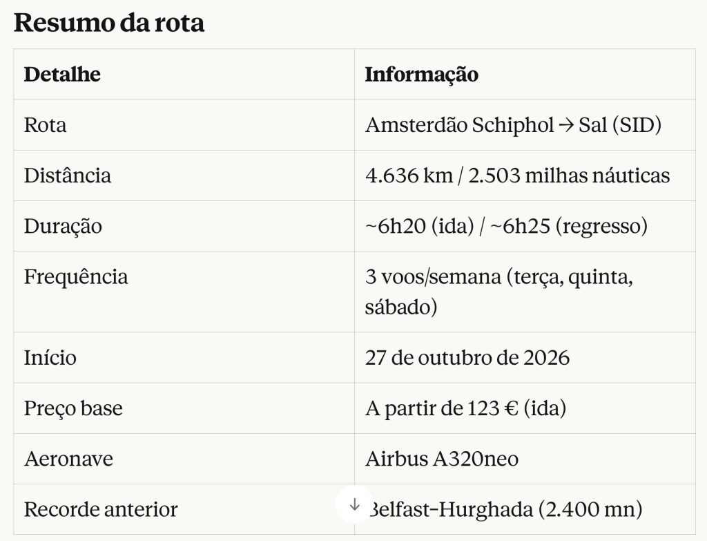 Cabo Verde entra na história da aviação europeia de baixo custo. A nova rota Amsterdão–Sal, anunciada pela EasyJet no âmbito da sua expansão para o inverno 2026-2027, vai ser o voo mais longo que a companhia alguma vez operou. Com 2.503 milhas náuticas — equivalente a 4.636 quilómetros em cada sentido — a ligação supera em cerca de 4% a anterior recordista da rede da companhia, a rota de Belfast para Hurghada, no Egito.