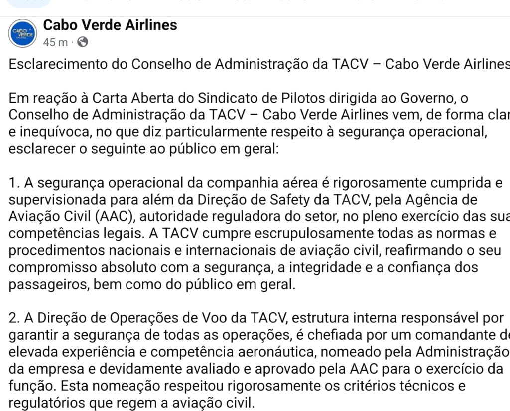 O Conselho de Administração da TACV reagiu reafirmando que a segurança operacional é rigorosamente cumprida sob supervisão da Direção de Safety e da Agência de Aviação Civil (AAC), garantindo o cumprimento das normas nacionais e internacionais. Acrescentou ainda que a Direção de Operações de Voo é chefiada por um comandante experiente aprovado pela AAC e que todas as decisões operacionais seguem os mais elevados padrões de segurança, não havendo margem para dúvidas infundadas.