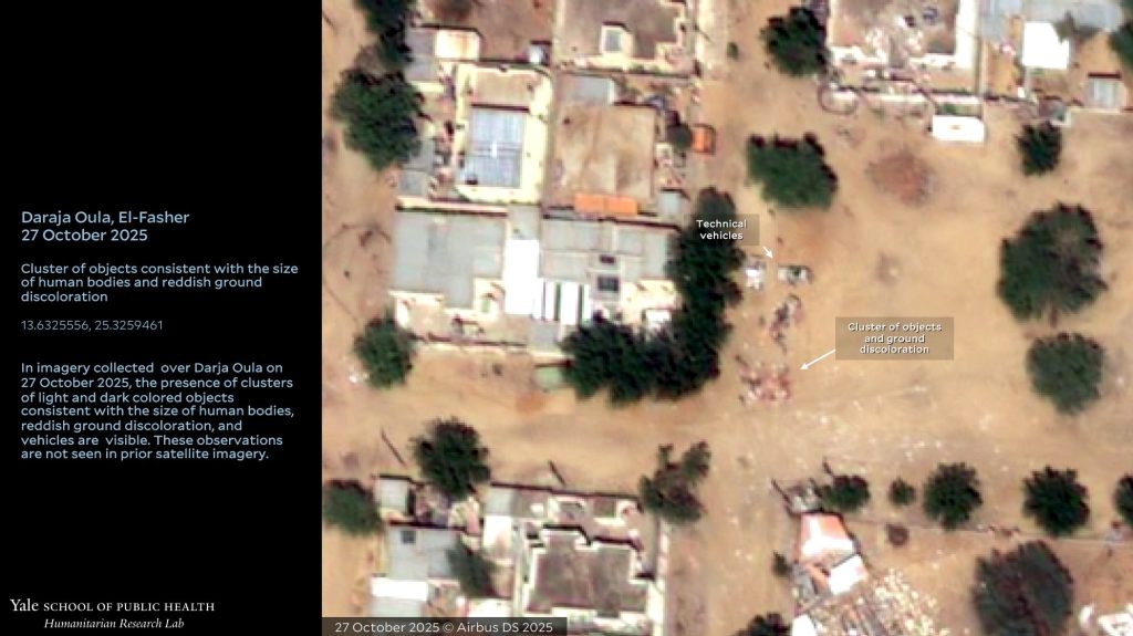 Nas imagens coletadas sobre Daraja Oula em 27 de outubro de 2025, são visíveis aglomerações de objetos claros e escuros compatíveis com o tamanho de corpos humanos, descoloração avermelhada do solo e veículos