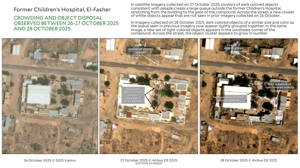 As três fotos em sequência mostram, por imagens de satélite, o aumento de pessoas e objetos ao redor do antigo Hospital Infantil de El-Fasher entre os dias 26 e 28 de outubro de 2025. Elas ilustram a formação de filas, aglomeração e descarte de objetos no local, revelando uma evolução rápida de movimentação e sinais de crise humanitária.