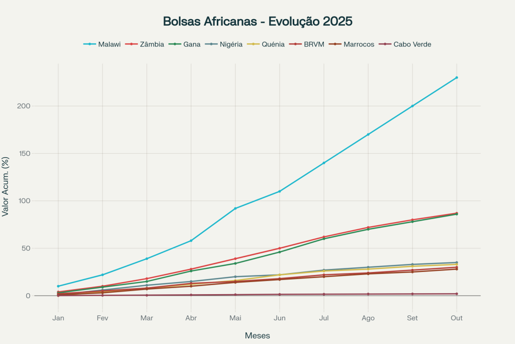 Maláui (Malawi Stock Exchange – MSE): O índice MASI valorizou-se mais de 230% até setembro de 2025, com destaque para o setor financeiro e telecomunicações. Empresas como National Investment Trust, Standard Bank Malawi e NICO Holdings lideraram os ganhos.