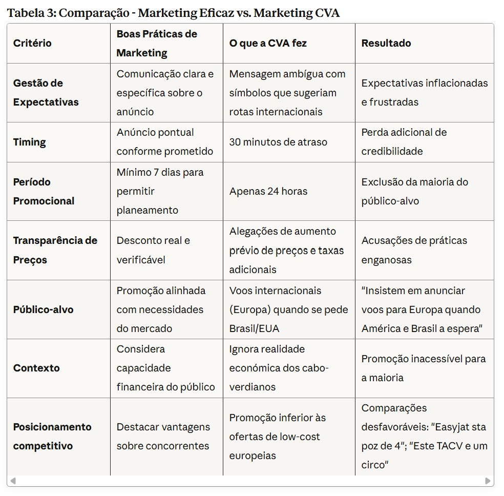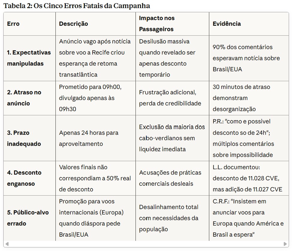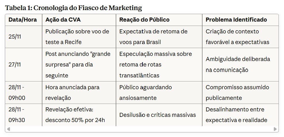 O primeiro e mais grave erro foi a criação deliberada de expectativas desproporcionadas. No dia 27 de novembro, a Cabo Verde Airlines publicou na sua página de Facebook: “Após vários pedidos, vamos atender…amanhã temos uma grande surpresa!” O post indicava horários específicos para o anúncio em diferentes fusos horários, incluindo bandeiras de Cabo Verde, Portugal, França, Brasil e Estados Unidos.