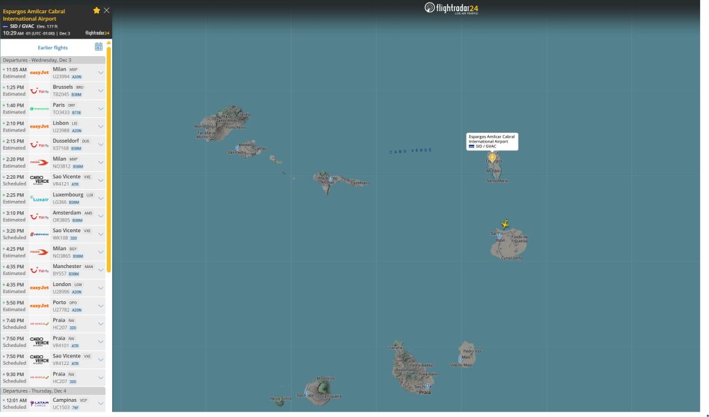 De acordo com dados do Flightradar24, consultados às 10h35 desta quarta-feira, 3 de dezembro, não se registam atrasos ou cancelamentos de voos no aeroporto do Sal. As operações aéreas decorrem sem perturbações significativas.