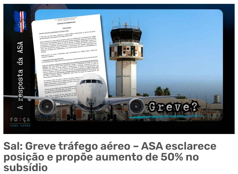 Uma greve dos controladores de tráfego aéreo está prevista para decorrer até ao dia 6 de dezembro no aeroporto internacional Amílcar Cabral, na ilha do Sal. No entanto, até ao momento, a situação mantém-se dentro da normalidade.