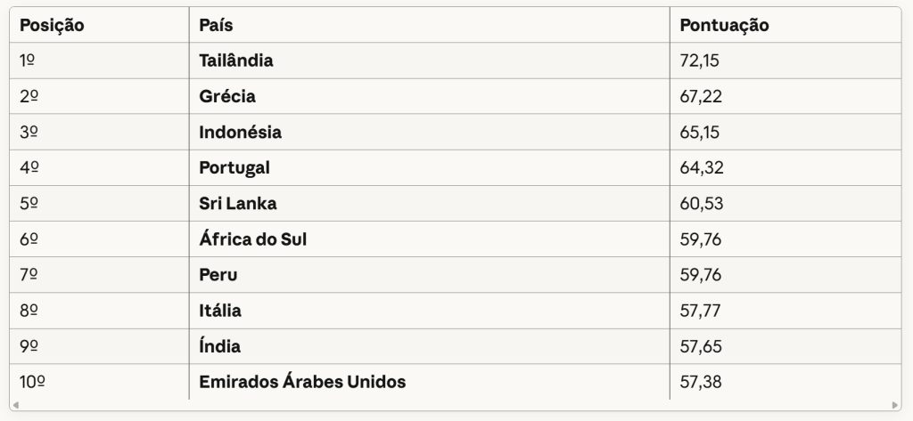 O arquipélago cabo-verdiano obteve uma pontuação de 52,35 pontos, posicionando-se entre destinos como Taiwan (37º com 52,40 pontos) e Montenegro (39º com 52,24 pontos). O ranking global é liderado pela Tailândia com 72,15 pontos, seguida pela Grécia (67,22) e Indonésia (65,15).