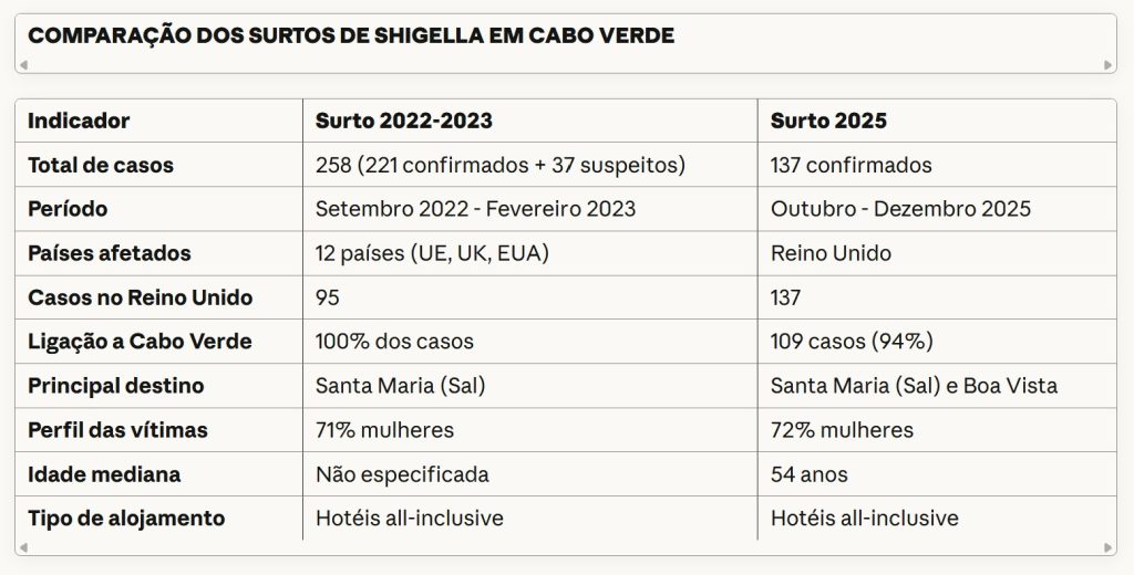Cabo Verde enfrenta um novo surto de infeções por Shigella sonnei entre turistas, três anos depois do primeiro alerta internacional. Desde 1 de outubro de 2025, o Reino Unido registou 137 casos confirmados da bactéria que causa diarreia grave, febre e cólicas abdominais. Destes, 109 casos (94%) estão diretamente ligados a viagens ao arquipélago cabo-verdiano, especificamente às regiões de Santa Maria (Sal) e Boa Vista.