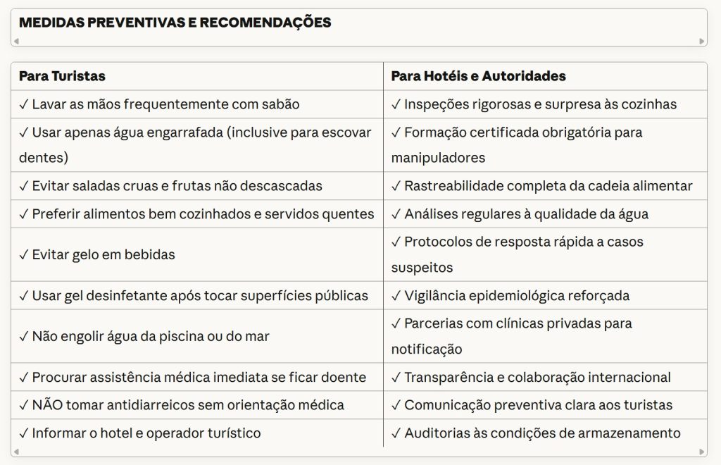 Especialistas apontam medidas urgentes: transparência e colaboração com organizações internacionais, inspeções surpresa rigorosas aos hotéis, rastreabilidade da cadeia alimentar para identificar fornecedores comuns, formação certificada obrigatória para manipuladores de alimentos, vigilância epidemiológica reforçada, protocolos claros de resposta a surtos, e comunicação preventiva aos turistas.