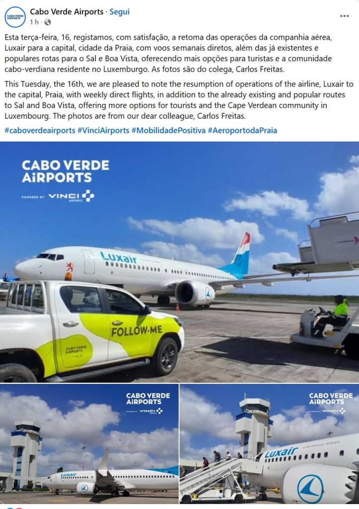 “A Cabo Verde Airports anunciou, esta terça-feira, o regresso dos voos semanais da companhia luxemburguesa à capital, reforçando a conectividade entre o arquipélago e a Europa”