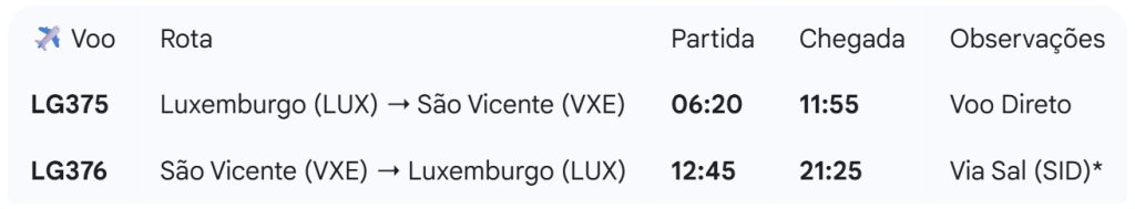 A ida (Luxemburgo → São Vicente): O voo sai do Luxemburgo às quintas-feiras de manhã. Trata-se de um voo non-stop, ou seja, o avião descola do Aeroporto do Findel e aterra diretamente em São Pedro, sem qualquer paragem intermédia. Com uma duração de cerca de 6 horas e 35 minutos, permite aos passageiros chegarem a São Vicente pouco antes da hora de almoço, ideal para aproveitar o resto do dia ou apanhar o barco da tarde para Santo Antão.