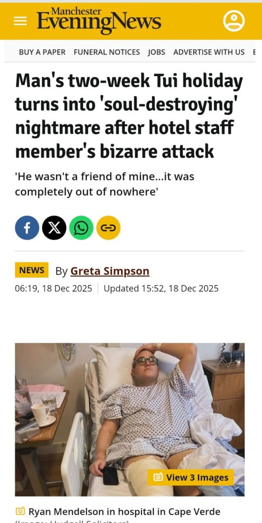 ​O que deveria ter sido um período de relaxamento na ilha da Boa Vista transformou-se num trauma físico e financeiro para o turista britânico Ryan Mendelson. O jovem de 33 anos, natural de Manchester, acaba de ser indemnizado em 18.000 libras (2.260 contos) após um incidente bizarro e violento ocorrido no Hotel RIU Touareg.
