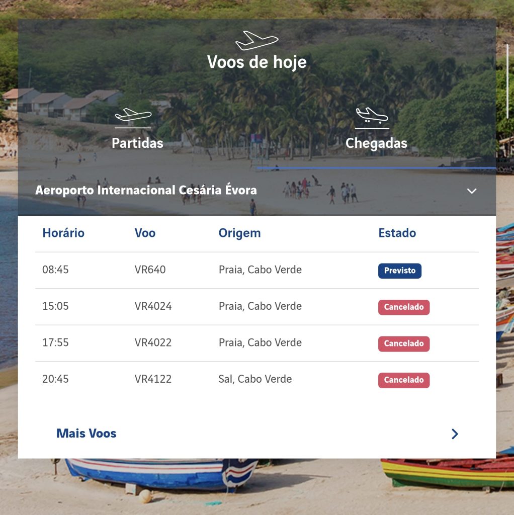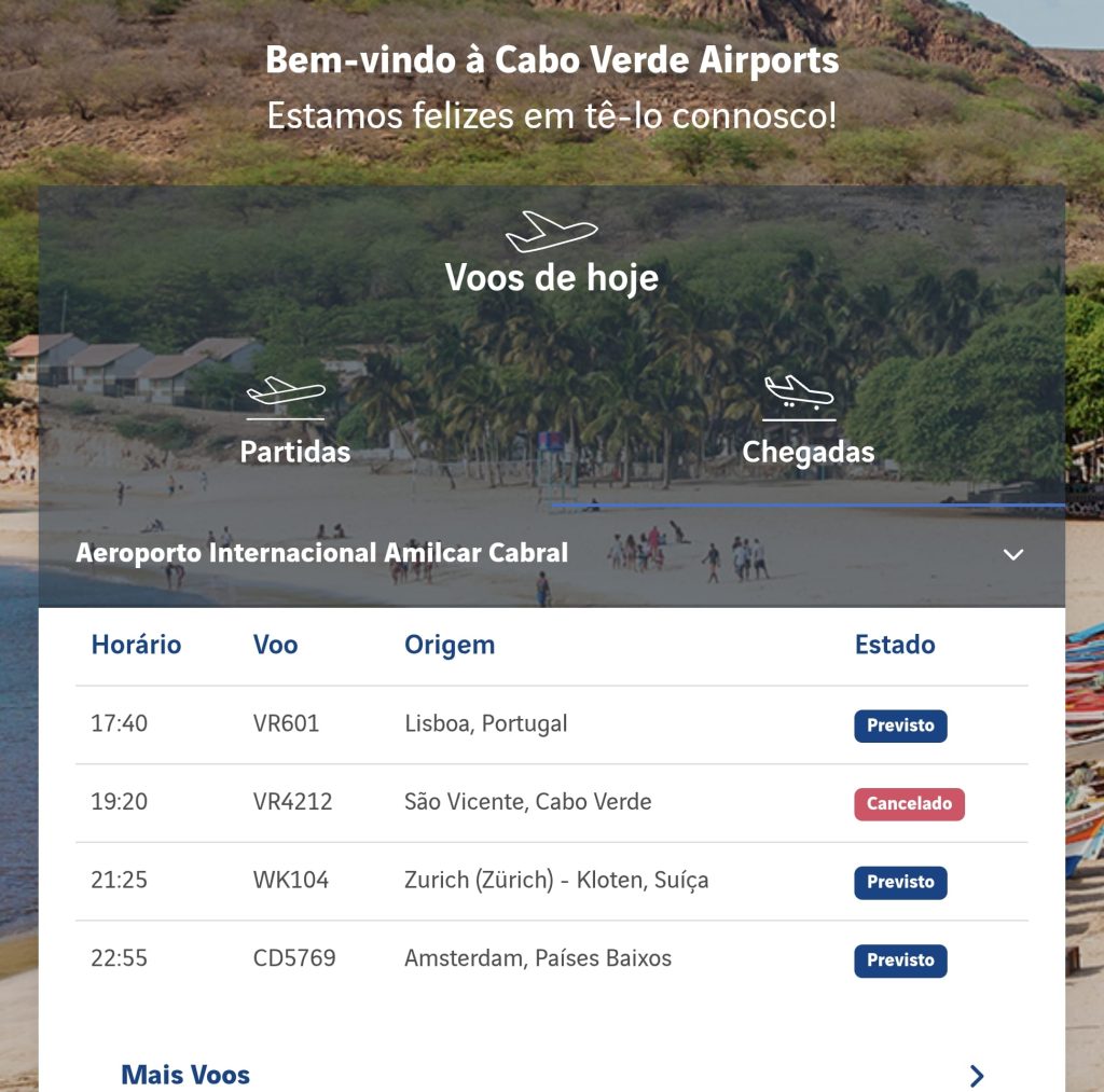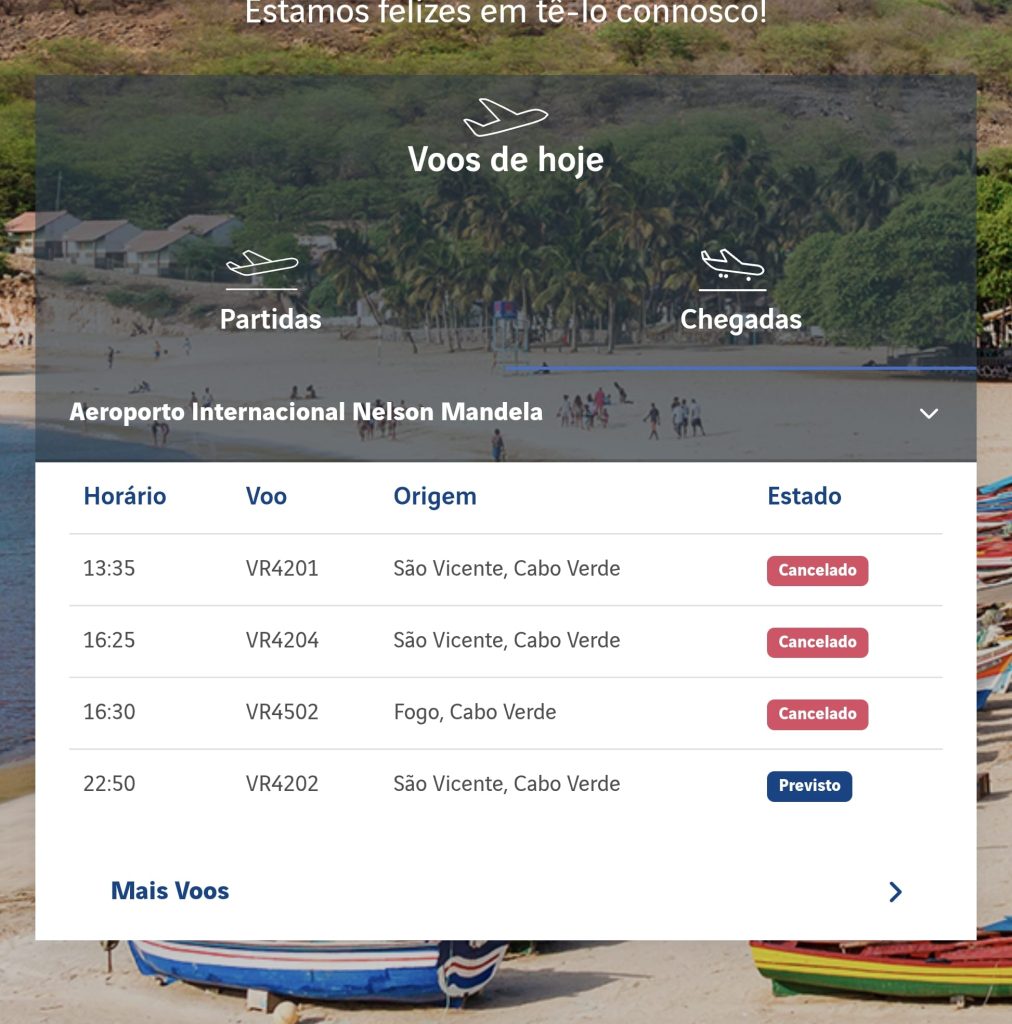 - Aeroporto Nelson Mandela (Praia): Estão cancelados os voos de chegada VR4201 e VR4204 de São Vicente, além da ligação VR4502 proveniente do Fogo.
