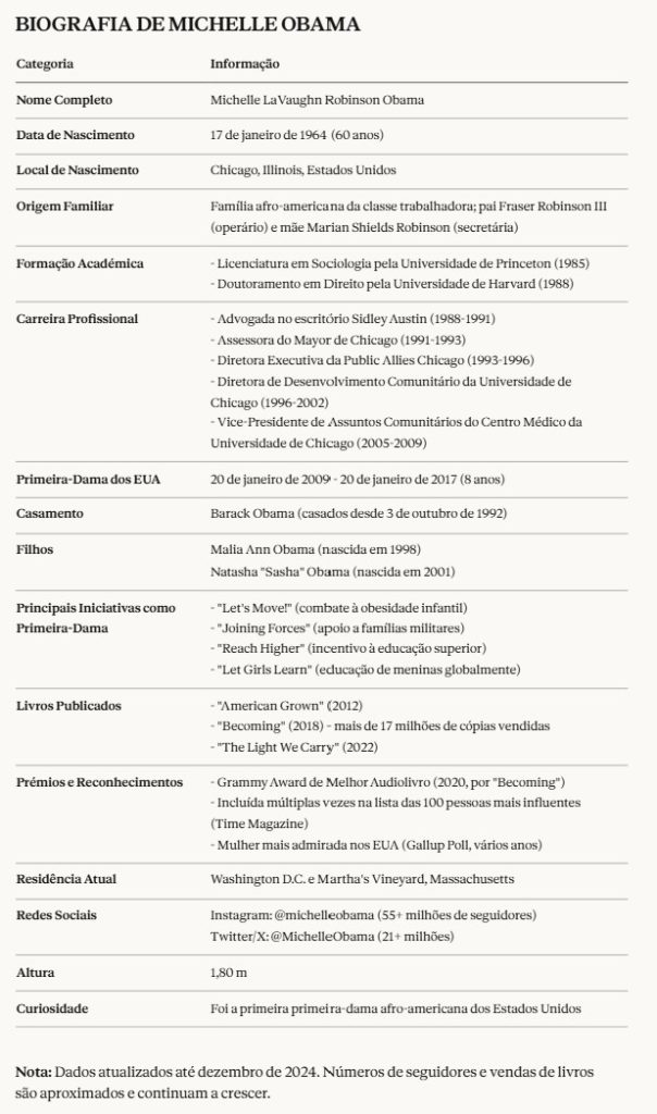 Michelle Obama deixou a Casa Branca em janeiro de 2017, após oito anos como primeira-dama dos Estados Unidos ao lado do presidente Barack Obama (2009-2017). Desde então, construiu uma carreira independente que a posicionou entre as personalidades mais influentes do planeta. Segundo a revista Forbes, ela integra regularmente as listas de mulheres mais poderosas do mundo, com mais de 55 milhões de seguidores nas redes sociais e livros que venderam dezenas de milhões de exemplares.