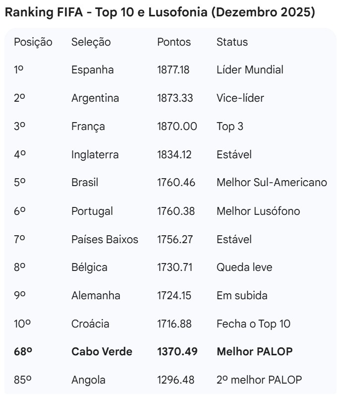 Com a liderança mundial a pertencer atualmente à Espanha, seguida de perto por Argentina e França, Cabo Verde olha para o horizonte com a confiança de quem já provou que o tamanho do país não limita o tamanho da ambição no futebol. O 68.º lugar não é apenas um número; é a prova de que o trabalho sério, a união do balneário e o apoio incondicional da diáspora e dos residentes estão a dar frutos históricos.