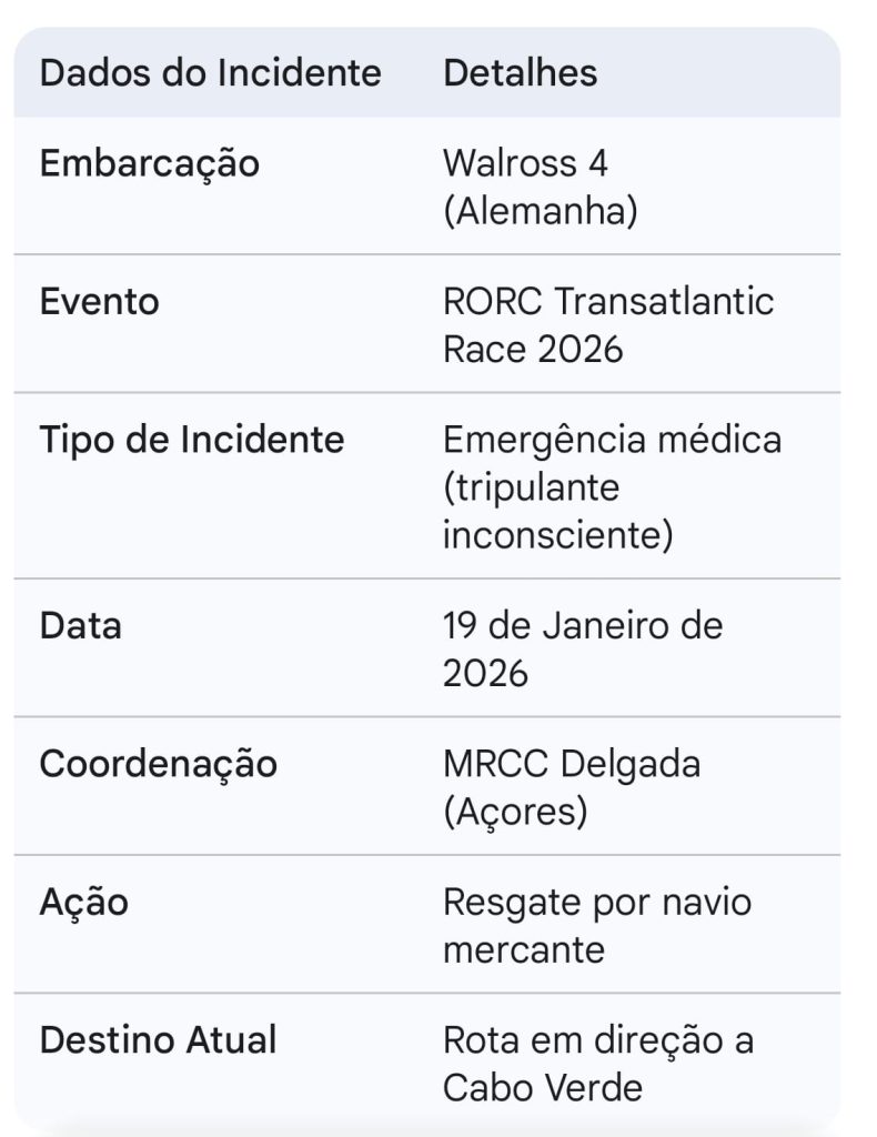 A prestigiada regata RORC Transatlantic Race, que liga as Ilhas Canárias às Caraíbas, foi palco de um momento dramático na passada segunda-feira, 19 de janeiro de 2026. O iate alemão “Walross 4”, uma das embarcações em competição, emitiu um pedido de socorro após um acidente a bordo que resultou na perda de consciência de um dos seus tripulantes. A complexa operação de resgate, coordenada no meio do Oceano Atlântico, colocou mais uma vez o arquipélago de Cabo Verde no centro da logística de salvamento marítimo, com um navio mercante a desviar a sua rota em direção às ilhas para assegurar a assistência necessária.