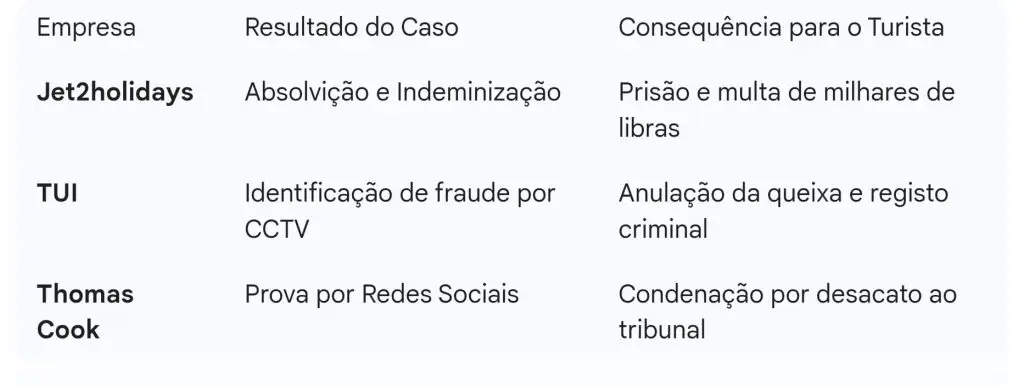 ​Um caso emblemático envolveu a Jet2holidays, onde um casal de turistas britânicos foi condenado a pagar uma indemnização de milhares de libras à operadora após ser provado que a sua queixa de “estômago severamente afetado” era falsa. A empresa utilizou fotos do Facebook que mostravam o casal a consumir grandes quantidades de álcool e a mergulhar na piscina no momento exato em que alegavam estar incapacitados. A operadora foi não só absolvida de pagar o indennizo, como viu os turistas serem condenados criminalmente.