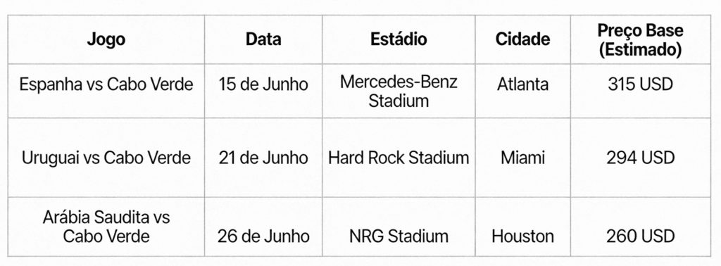Os valores dos bilhetes variam significativamente consoante a importância do jogo e a localização no estádio. Para o aguardado duelo contra o Uruguai, no Hard Rock Stadium em Miami, os preços em sites de revenda começam aproximadamente nos 294 USD (cerca de 30.000 CVE) em categorias superiores, podendo ultrapassar os 930 USD para lugares de Categoria 2 ou zonas mais privilegiadas do recinto. Já para a estreia contra a Espanha em Atlanta, os valores base situam-se em torno dos 315 USD. É recomendável que os adeptos comparem as taxas de serviço antes de finalizar a compra nestes portais.