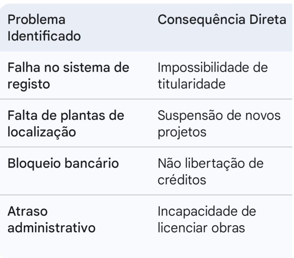 Ordinary citizens are also penalized. In Cape Verde, the vast majority of real estate purchases depend on bank credit. Financial institutions only release loan funds after presentation of the land registry certificate. With the system blocked, financing processes are at a standstill, preventing families from completing their purchases and leaving real estate developers without the liquidity necessary to honor their commitments.
