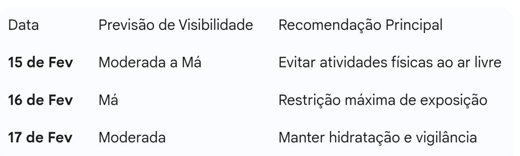 “Alerta de visibilidade reduzida e riscos à saúde entre 15 e 17 de fevereiro”