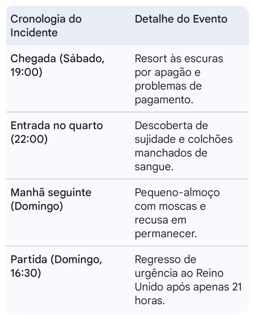 O calvário começou logo à chegada, no sábado, quando o complexo se encontrava às escuras devido a um corte de energia. A situação agravou-se na receção: a direção alegou que o pagamento do quarto não tinha sido efetuado pela operadora, obrigando a família a pagar novamente do próprio bolso para poder aceder ao alojamento, apesar de já terem liquidado o pacote total com antecedência no Reino Unido.