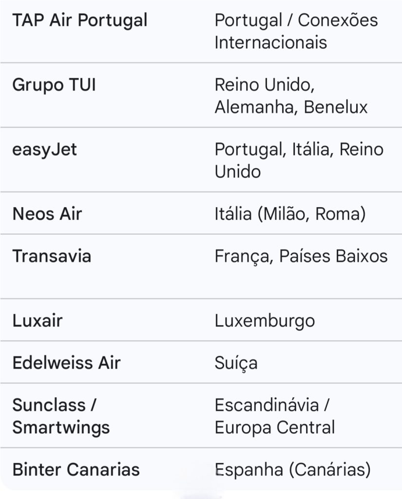 Grupo TUI (TUI Airways, TUI fly): Vital para o turismo de massa, com voos diretos do Reino Unido, Alemanha, Bélgica e Países Baixos para Sal e Boa Vista.